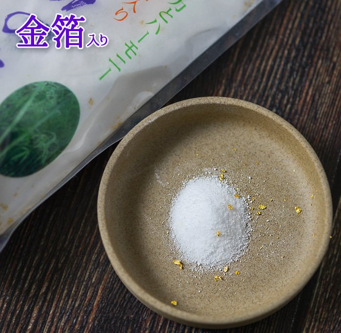原材料:天日塩(メキシコ)、さんごカルシウム、金箔