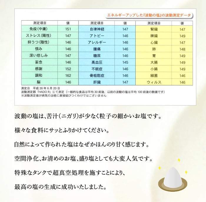 ★波動測定器「HADO R」にて測定したところ、一般的食品は平均値30前後でしたが、波動の塩は平均値100前後の数値を出しました。[H26年6月20日測定]