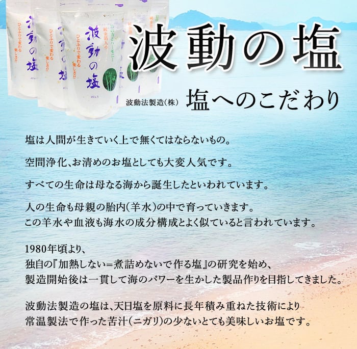 波動法製造の塩は、天日塩を原料に長年積み重ねた技術により常温製法で作った苦汁(ニガリ)の少ないとても美味しいお塩です。